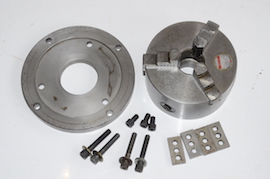 The chuck mounting plate is 5.25" diameter with the chuck sitting snugly in the plate's recess. There is no chcuk key but these are easily acquired.